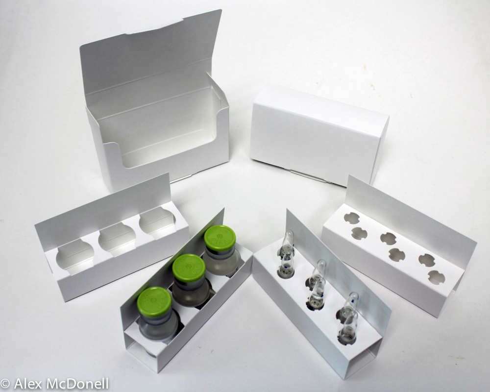 This ampule tray detail highlights the product stability needed for shipping glass injection ampules.