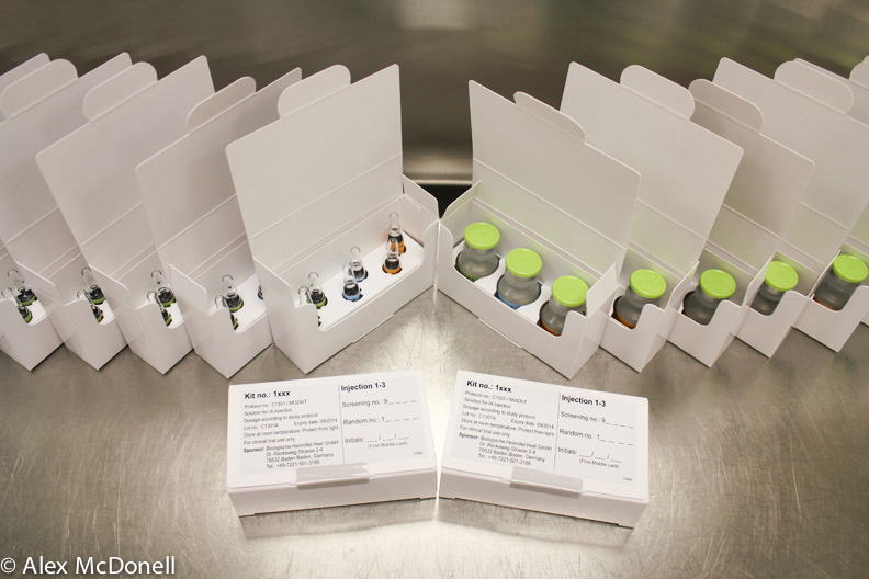 Final cartons with sample labeling for a presentation prior to actual distribution of study medications.